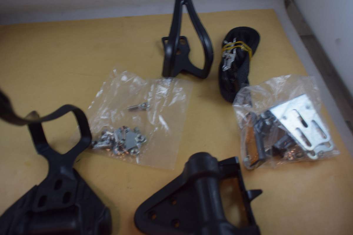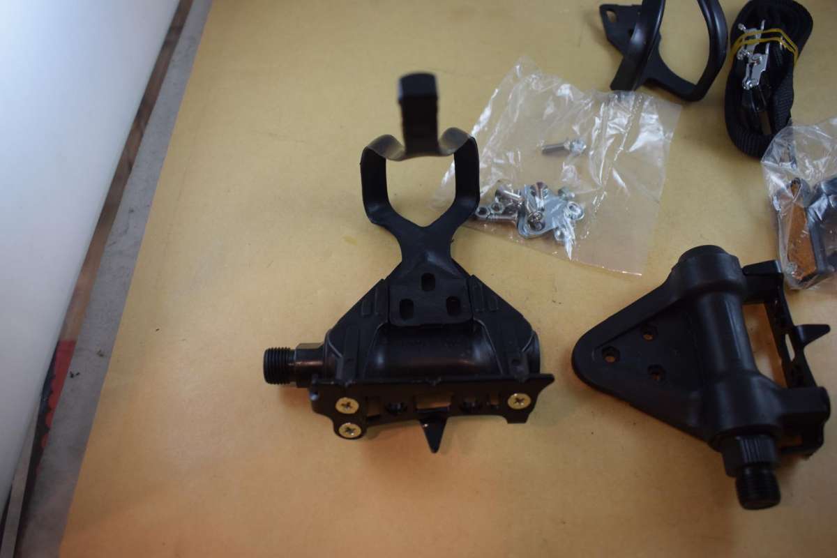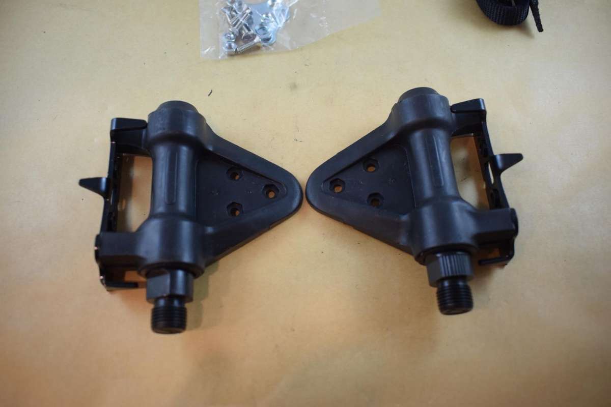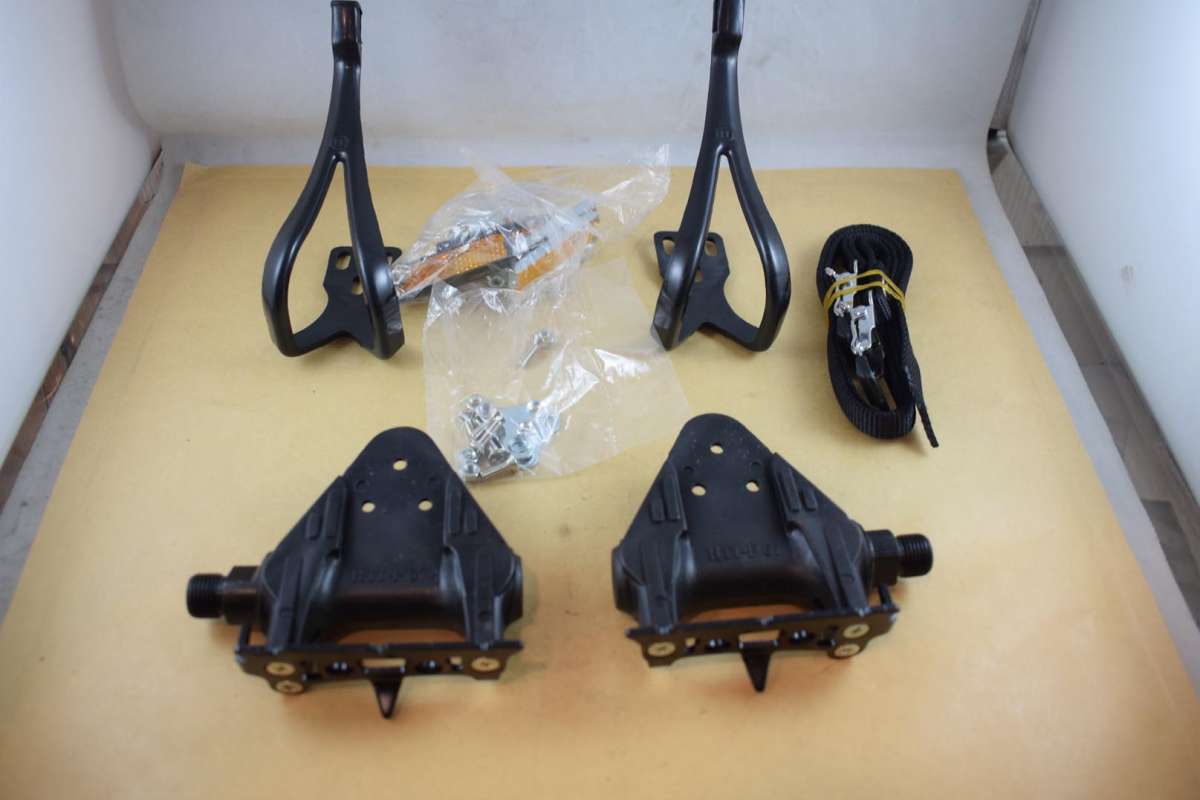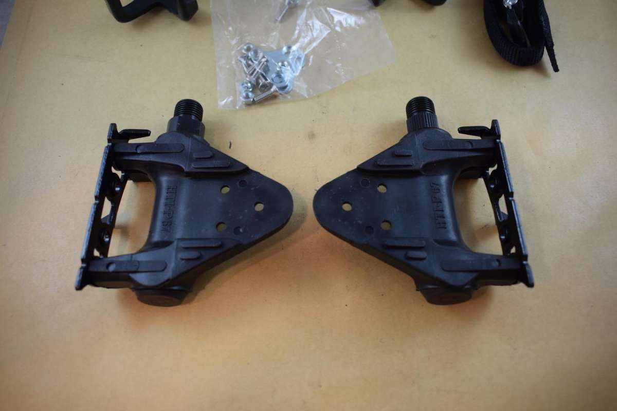 HTI P67 pedal set with toe clips 9/16 vintage black plastic body NOS